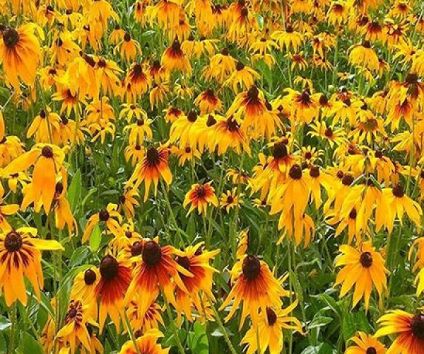 毛葉金光菊,又稱黑心菊,為菊科金光菊屬多年生宿根草本花卉,常作一、二年生草花栽培。株高80至100厘米,全株被有粗糙的剛毛,在近基部處分枝。葉互生,莖下部葉匙形,長10至15厘米,莖上部葉長橢圓形或披針形,均全緣,無柄。頭狀花序單生,花徑10至15厘米。盤緣舌狀花金黃色,有時(shí)有棕色環(huán)帶,有時(shí)呈半重瓣。管狀花暗棕色,聚集呈半球形突起,直徑2至3厘米,高2厘米左右。花期5至11月。 黑心菊耐寒,又耐干旱,對(duì)土壤適應(yīng)性好,管理較為粗放。繁殖可在9月播種。幼苗初期生長緩慢,長至4片真葉后移植一次,于11月初定植。冬季以低溫通過階段發(fā)育,次年春季抽莖,5月開花。 黑心菊花朵大,色彩鮮艷,花期又長,常作花壇、花徑材料,亦可盆栽家庭觀賞或作切花材料。